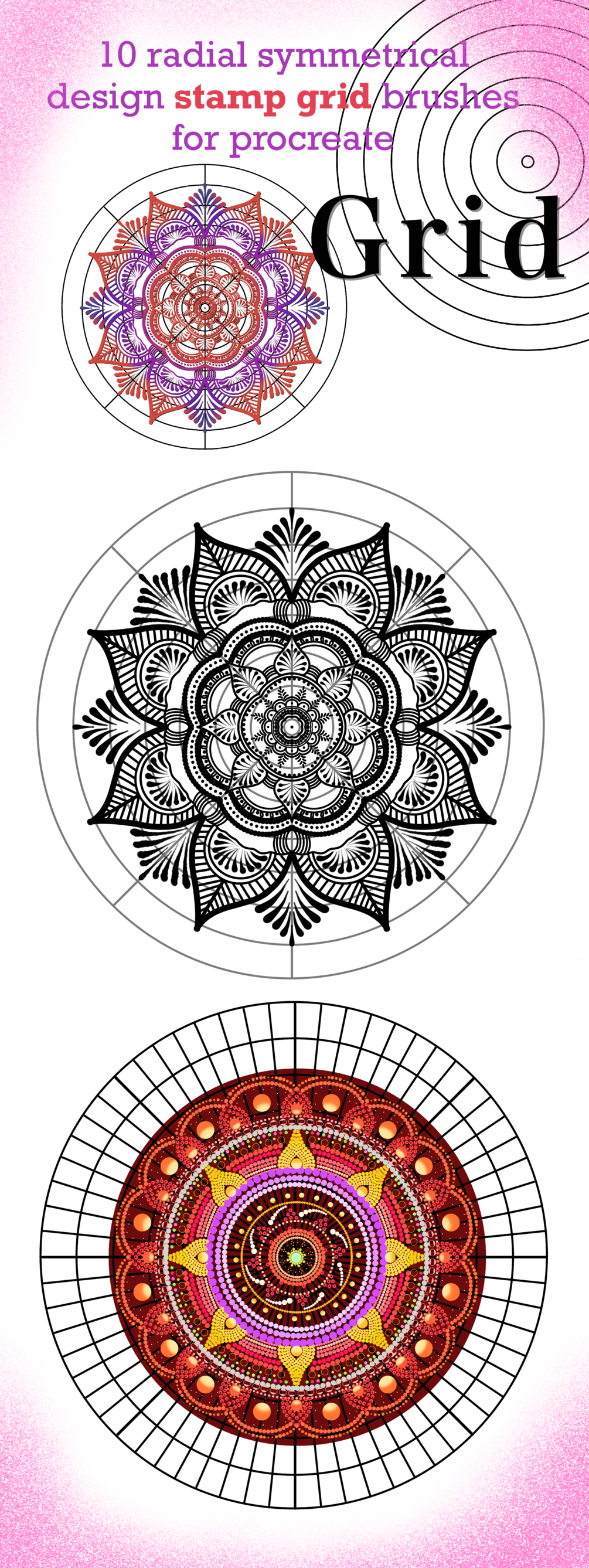 10 grid (stamp) brushes for Procreate that can help you to draw radial symmetrically perfect Mandala art designs.